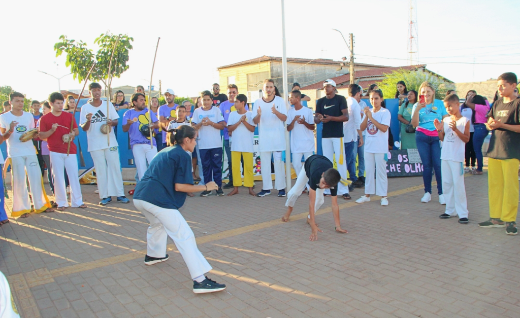 Integrantes do Serviço de Convivência e Fortalecimento de Vínculos (SCFV) da Assistência Social também se apresentaram com a Capoeira, uma expressão cultural que envolve arte marcial, dança e música.