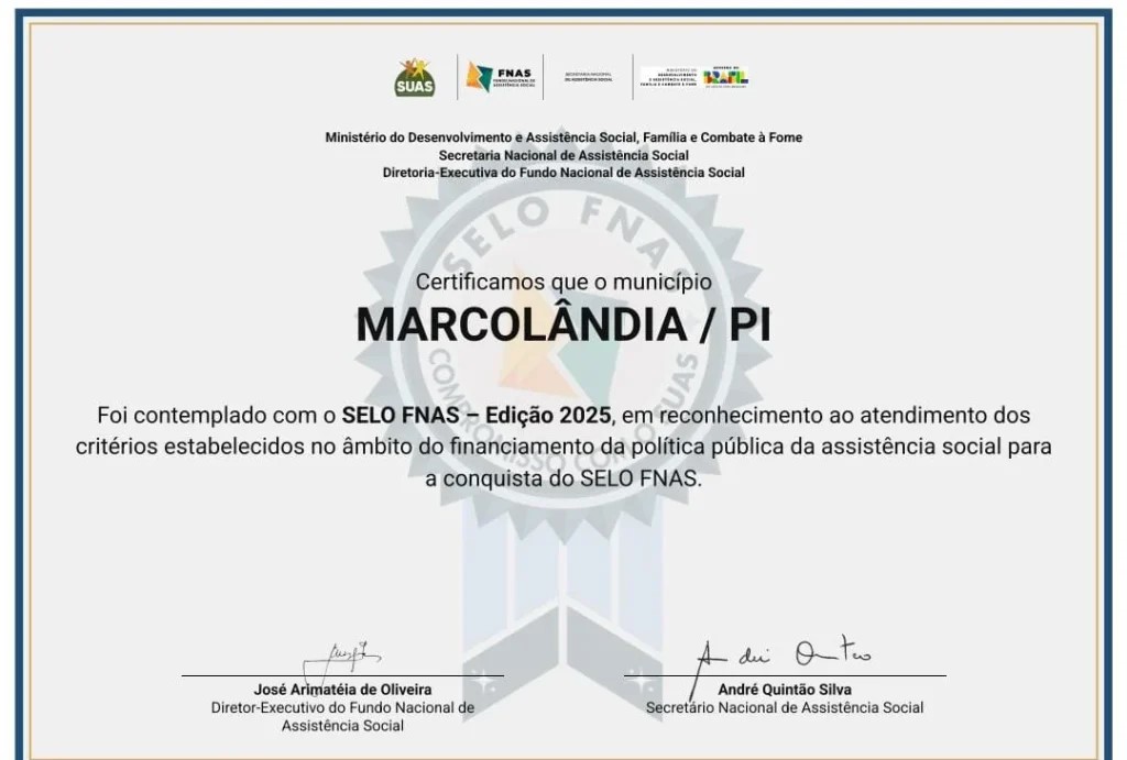O município de Marcolândia celebra uma importante conquista: a certificação com o Selo FNAS – Edição 2025, concedido pelo Fundo Nacional de Assistência Social (FNAS). O reconhecimento é resultado do cumprimento dos critérios estabelecidos no âmbito do financiamento da política pública de assistência social.